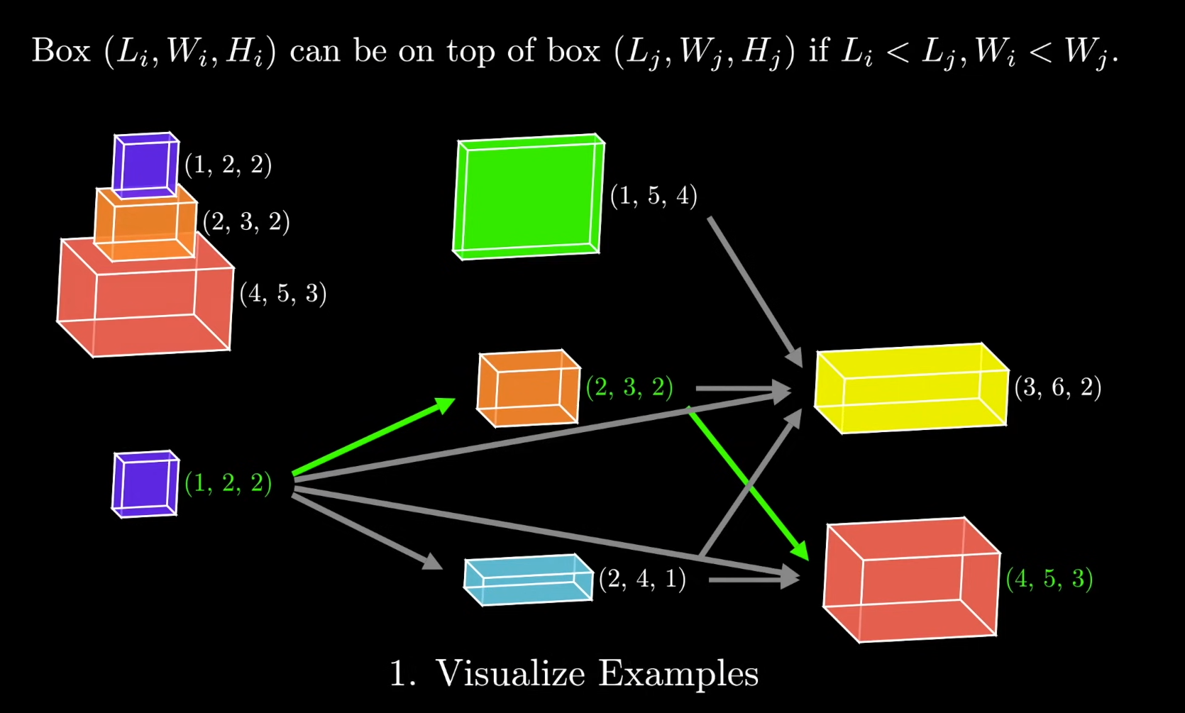 First we can visualise the problem by mapping each box to any box it can be stacked on. Notice that each path in this directed acyclic graph is a valid stack of boxes. To solve this question we need to find the path that gives the greatest height.