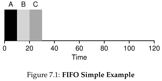 Imagine three jobs arrive in the system, A, B, and C, at roughly the same time (). Because FIFO has to put some job first, let’s assume that while they all arrived simultaneously, A arrived just a hair before B which arrived just a hair before C. Assume also that each job runs for 10 seconds. What will the average turnaround time be for these jobs? 20 seconds.