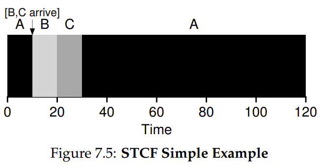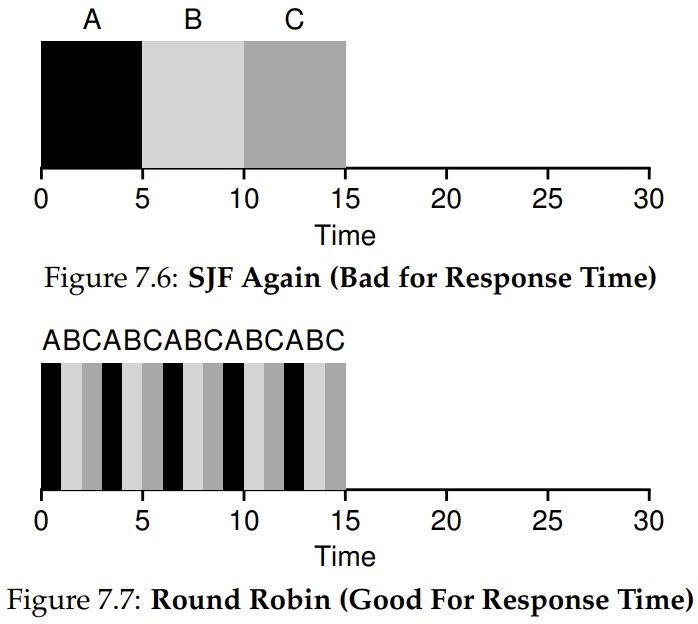 STCF and related disciplines are not particularly good for response time. If three jobs arrive at the same time, for example, the third job has to wait for the previous two jobs to run in their entirety before being scheduled just once. While great for turnaround time, this approach is quite bad for response time and interactivity. Indeed, imagine sitting at a terminal, typing, and having to wait 10 seconds to see a response from the system just because some other job got scheduled in front of yours. How can we build a scheduler that is sensitive to response time?