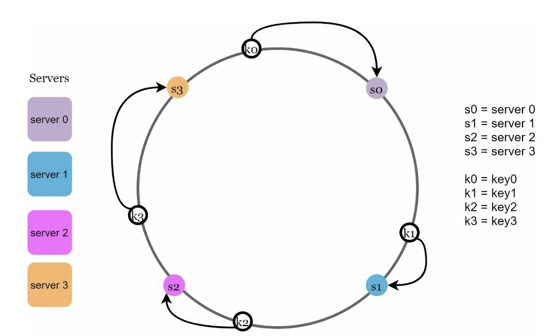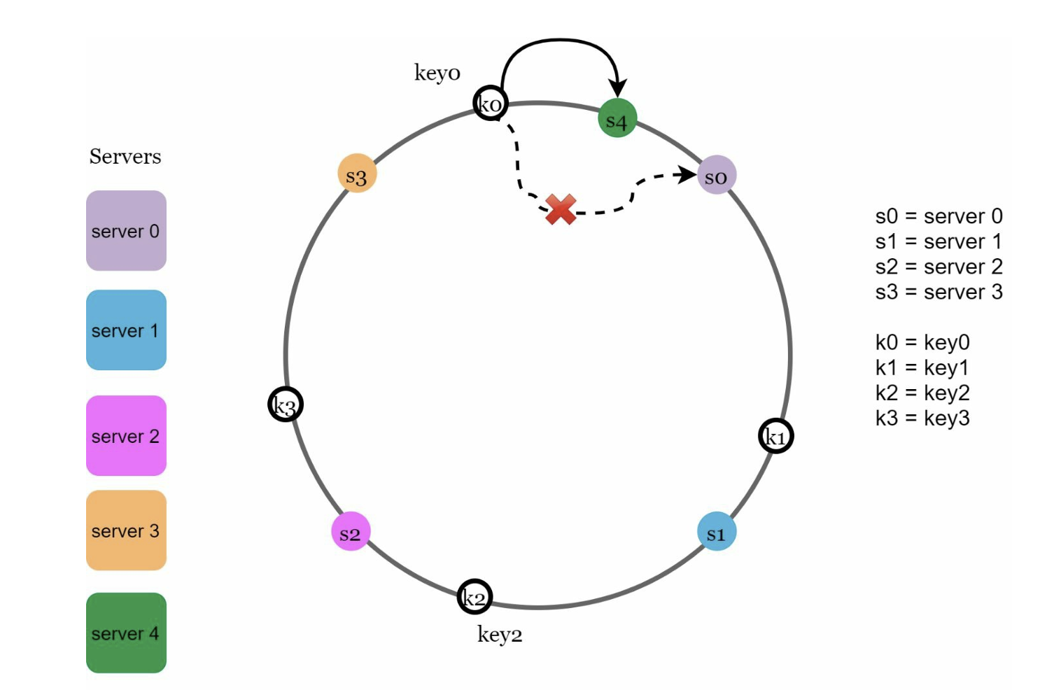 If a node goes down e.g s0 in the scenario above then k0 will map to s1 instead.