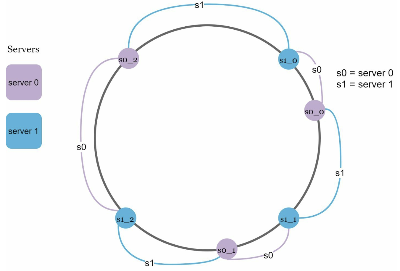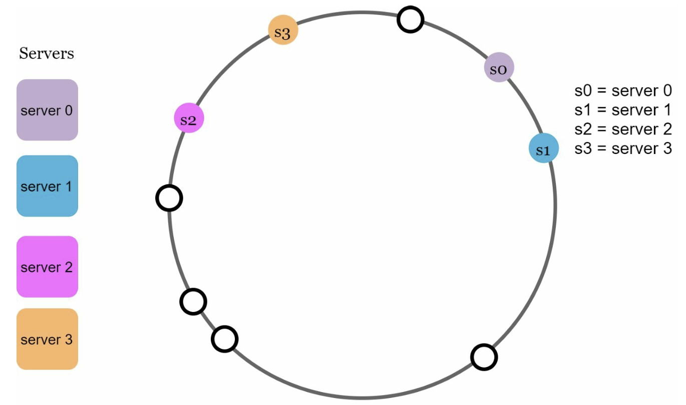 In this scenario s2 is responsible for 4 keys, s0 for 1 key and s3 and s1 responsible for 0. To prevent overloading a single server we need to uniformly distribute the servers around the ring. Adding more physical servers can be expensive. We can instead add virtual nodes. A virtual node a single server assigned to multiple different positions in the ring. Doing this can redistribute the load more uniformly without more physical servers.