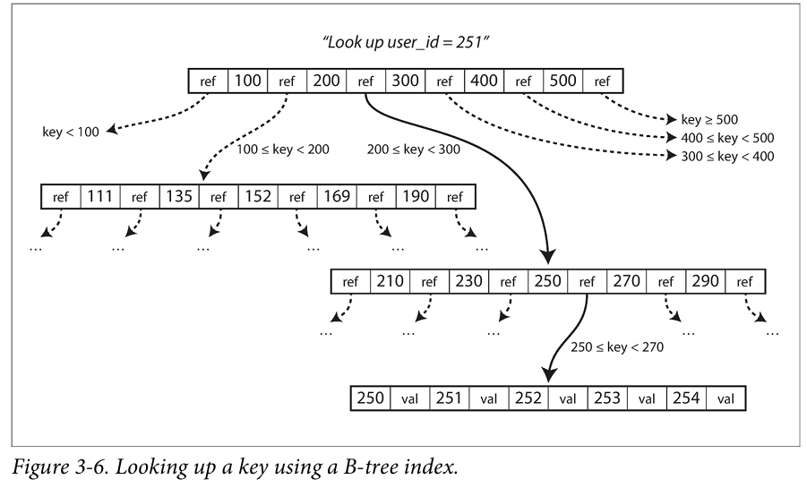 This tree always rebalanced as required when data is inserted or deleted. A B-tree with keys will always have a depth of . Most databases can fit into a B-tree that is three or four levels deep, so you don’t need to follow many page references to find the page you are looking for. (A four-level tree of 4 KB pages with a branching factor of 500 can store up to 256 TB.)